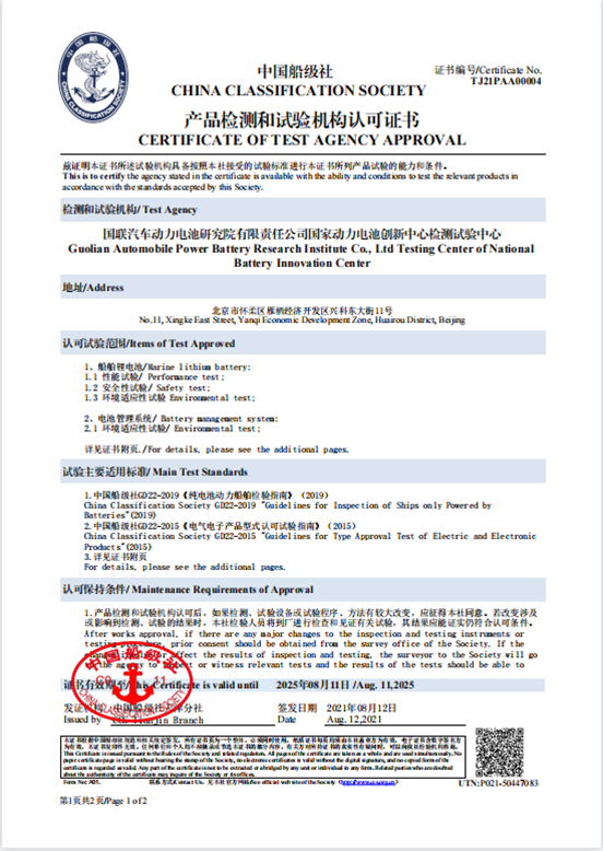 8月12日,國聯(lián)研究院國家動(dòng)力電池創(chuàng)新中心檢測(cè)試驗(yàn)中心正式取得中國船級(jí)社“船舶鋰電池性能、安全、環(huán)境適應(yīng)性試驗(yàn)”和“電池管理系統(tǒng)環(huán)境適用性試驗(yàn)”資質(zhì),并順利獲得相應(yīng)產(chǎn)品檢測(cè)和試驗(yàn)機(jī)構(gòu)認(rèn)可證書,成為具備依照中國船級(jí)社標(biāo)準(zhǔn)開展船舶鋰電池及電池管理系統(tǒng)產(chǎn)品相關(guān)檢測(cè)和試驗(yàn)的第三方機(jī)構(gòu)。檢測(cè)試驗(yàn)中心現(xiàn)已具備動(dòng)力電池、儲(chǔ)能電池、船舶電池等多領(lǐng)域電池認(rèn)證檢測(cè)資質(zhì)能力。