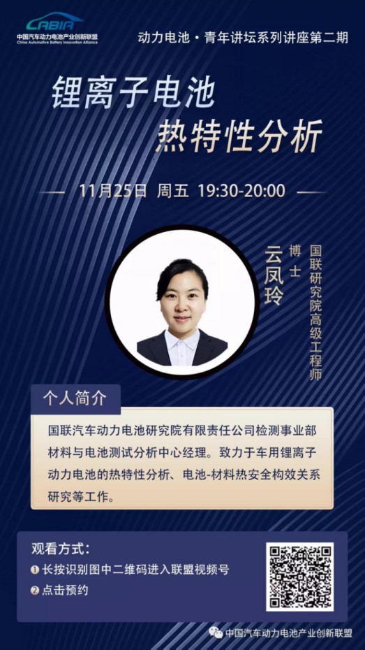 國(guó)家動(dòng)力電池創(chuàng)新中心“動(dòng)力電池·青年講壇”系列講座繼續(xù)開(kāi)講,11月25日,講座第二期順利上線。本期講座采取視頻號(hào)直播形式,邀請(qǐng)國(guó)聯(lián)研究院檢測(cè)事業(yè)部云鳳玲博士專題分享鋰離子電池?zé)崽匦苑治?/span>研究成果。來(lái)自行業(yè)企業(yè)、高校的青年學(xué)者近300人參與互動(dòng)交流,探討鋰離子電池?zé)崽匦苑治?/span>與電池安全設(shè)計(jì)的關(guān)系、熱特性參數(shù)相關(guān)檢測(cè)方法等技術(shù)問(wèn)題,為鋰離子電池安全性能的改善提供思路,取得了互促共進(jìn)、共同提升的效果。