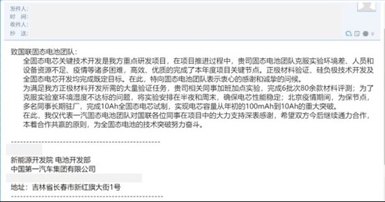 12月8日,國聯(lián)研究院固態(tài)電池團(tuán)隊收到股東單位中國第一汽車集團(tuán)有限公司新能源開發(fā)院電池研究所發(fā)來的感謝信。