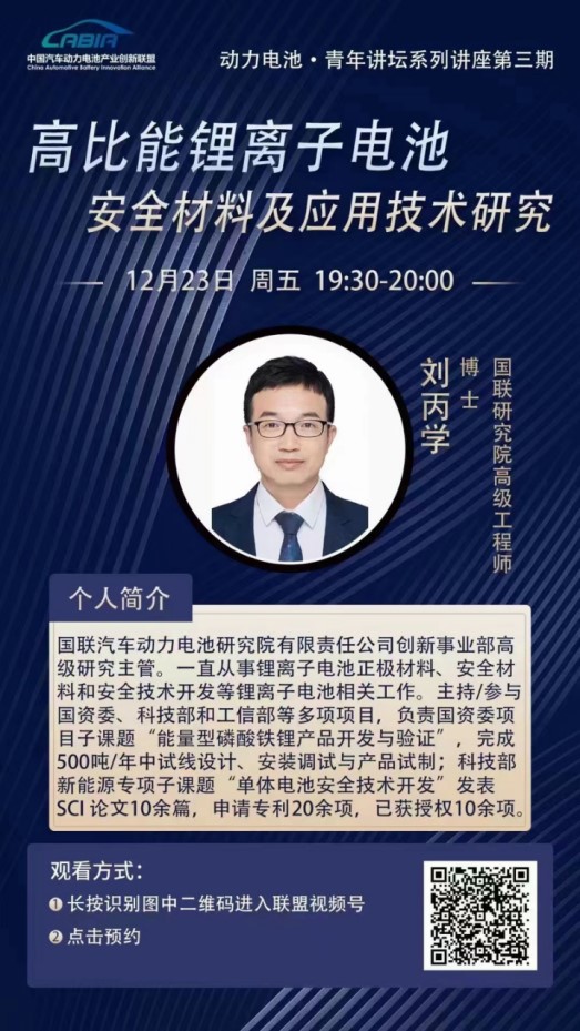12月23日,國(guó)家動(dòng)力電池創(chuàng)新中心“動(dòng)力電池·青年講壇”系列講座第三期線(xiàn)上直播方式開(kāi)講。本期講座邀請(qǐng)國(guó)聯(lián)研究院創(chuàng)新事業(yè)部高級(jí)研究主管劉丙學(xué)博士專(zhuān)題分享高比能鋰離子電池安全材料及應(yīng)用技術(shù)研究相關(guān)內(nèi)容,互動(dòng)交流探討安全添加劑材料設(shè)計(jì)及應(yīng)用,安全電解液設(shè)計(jì)及應(yīng)用, 高比能電池安全技術(shù)集成等方面的知識(shí),為動(dòng)力電池安全材料及應(yīng)用技術(shù)研究提供思路。來(lái)自企業(yè)、行業(yè)機(jī)構(gòu)、科研院所等專(zhuān)業(yè)人士500余人線(xiàn)上參講座直播,取得了互促共進(jìn)、共同提升的效果。