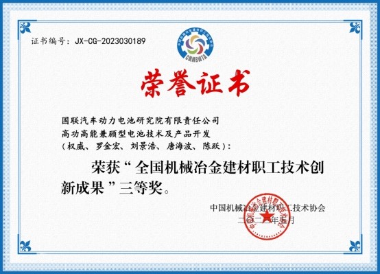 近日,由中國機械冶金建材職工技術(shù)協(xié)會主辦的“2023年全國機械冶金建材行業(yè)職工技術(shù)創(chuàng)新成果”評選結(jié)果揭曉,國聯(lián)研究院推薦申報項目《高功高能兼顧型電池技術(shù)及產(chǎn)品開發(fā)》榮獲三等獎。
