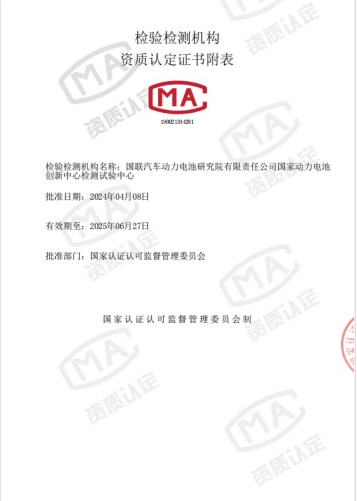 近日,國聯(lián)研究院國家動力電池創(chuàng)新中心檢測試驗中心順利通過中國合格評定國家認可委員會(CNAS)及國家認證認可監(jiān)督管理委員會(CMA)擴項評審,新增GB/T 36276-2023及GB/T 31467-2023標準認可能力,現(xiàn)已正式公布。